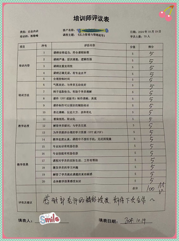 中國建筑集團(tuán)某骨干企業(yè)《壓力管理與情緒疏導(dǎo)》完美收官!“壓力情緒管理專家”郭敬峰老師精彩分享:“壓力管理技巧、心理健康關(guān)愛、情緒疏導(dǎo)方法、現(xiàn)場解疑答惑等”。課程風(fēng)趣幽默,寓教于樂,結(jié)合案例實操演練,充分調(diào)動學(xué)員積極性,工具方法落地,《培訓(xùn)師評議表》滿分好評反饋,感謝大家熱情學(xué)習(xí)!